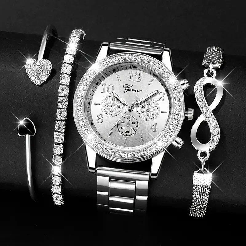 4-Peice Fashionable Women's Quartz Watch Set - Rhinestone Stainless Steel Bands